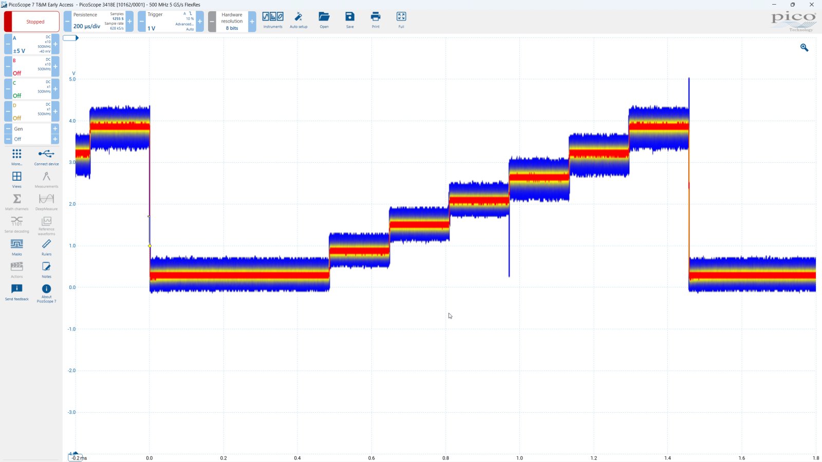 Some oscilloscopes struggle when you enable deep memory; the screen update rate slows and the controls become unresponsive. The PicoScope 3000E Series avoids this limitation with the use of a dedicated fourth-generation hardware acceleration (HAL4) engine inside the oscilloscope.